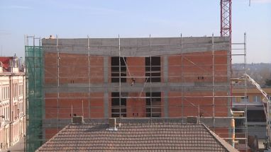 Na stavbě v měsíci listopadu, i díky příznivému počasí, pokračovaly stavební práce v prostoru vymezeném obvodovými zdmi. Jednalo se zejména o betonování stropů mezi jednotlivými patry. Dále pokračovala stavba zdí v prostoru původního sila. Při pohledu z vnějšku se začal rýsovat prostor auly ve čtvrtém a pátém patře. |